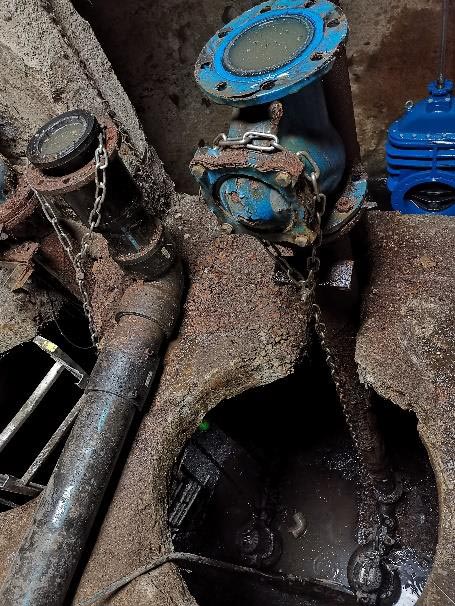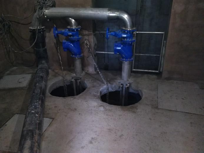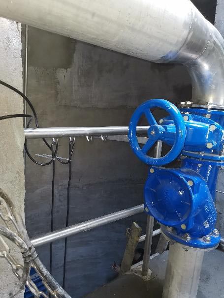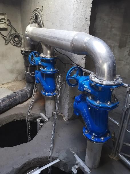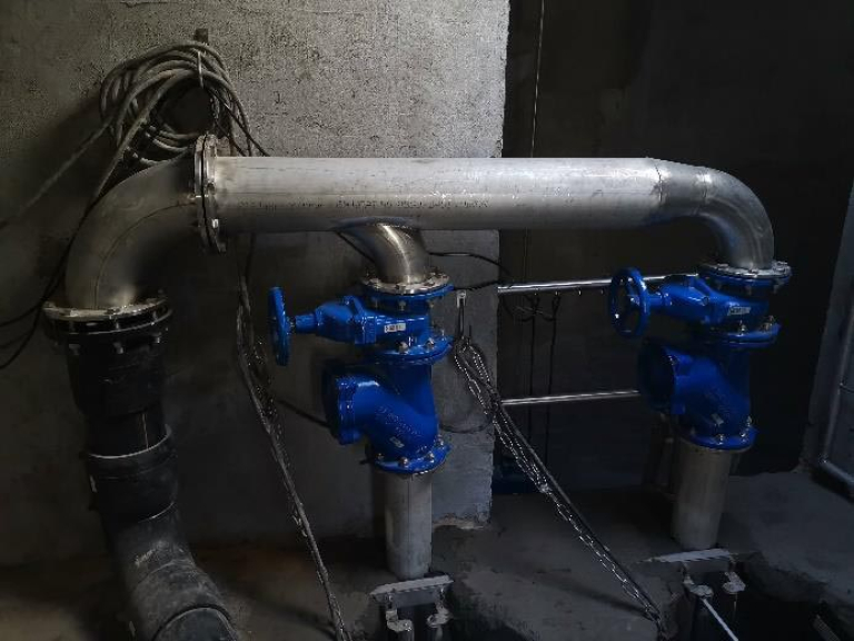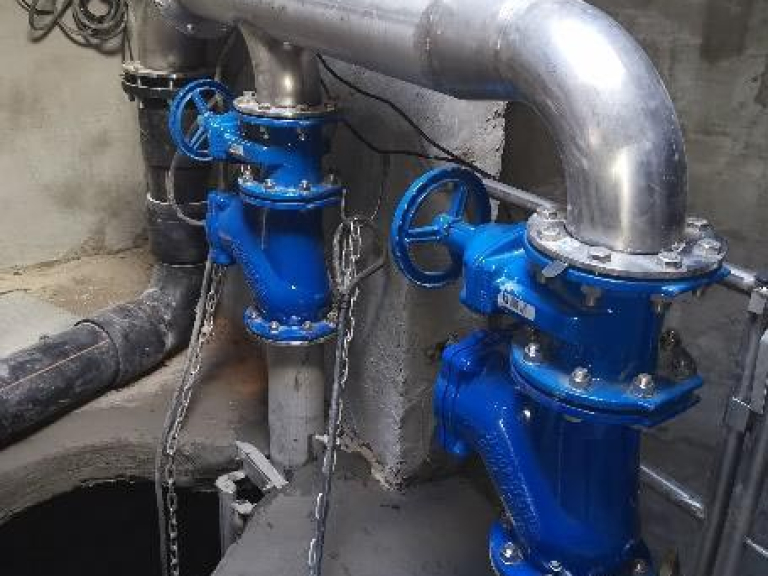 - Gépészeti felújítás teljes belső gépészet bontása, nyomócsövek és vezetőcsövek cseréje KO36-KO35 minőségűre, 2db új AVK DN150 tolózár és 2db új DN150 golyós visszacsapó szelep beépítése, a közös ágra 1db új AVK DN200 tolózár beépítése, 2db új Flygt DN150 talpidom cseréje + 2” KO vezetőcső tartó beépítése, közös nyomócső cseréje beépített T-idom karimájáig új D225 KPE csőre. A provizorhoz beépített DN200/80 öv. T-idom + 1db AVK DN80 tolózár + DN80 KO vakkarima megmarad a közösített nyomócső ágon.