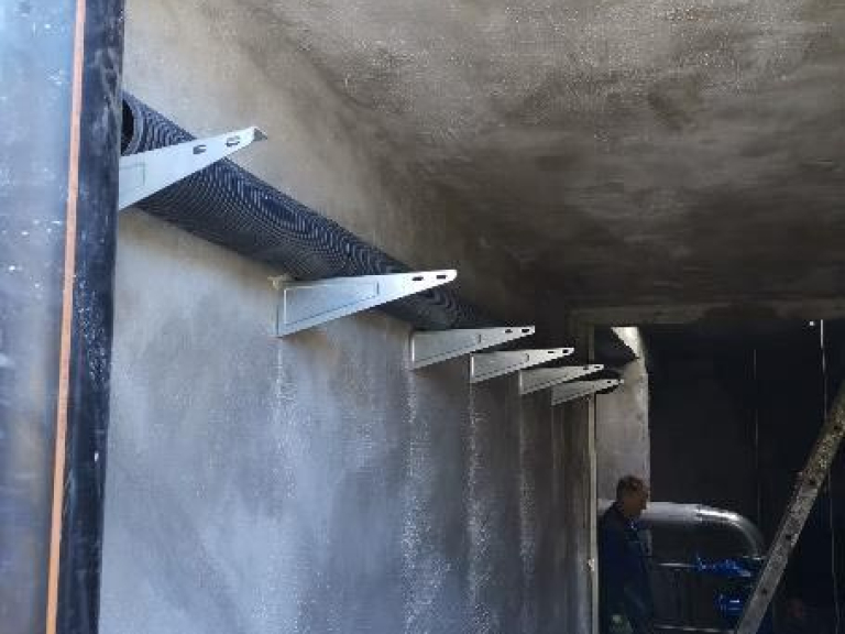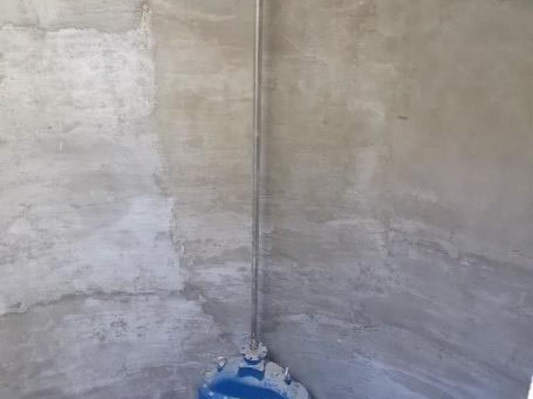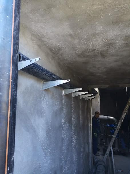 - Az belső falfelületek tisztítása nagynyomású vízzel (1000-2000 bar szükség szerint), gurulós mobilállványok használata, többszöri átrakással, tapadó híd felvitele SAKRET SHG 0,2kg/m2, szennyvízálló bevonat felhordása 12kg/m2 anyagfelhasználással, SAKRET MHS habarccsal anyagában besimítva, utókezelés betonjavítás, kiegyenlítés szigetelő bevonat alá PCC habarccsal átlag 1 cm vastagságban (becslés)